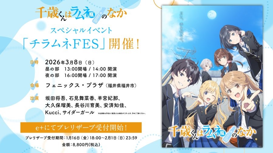 TVアニメ『千歳くんはラムネ瓶のなか』 スペシャルイベント「チラムネFES」 の開催が決定いたしました。