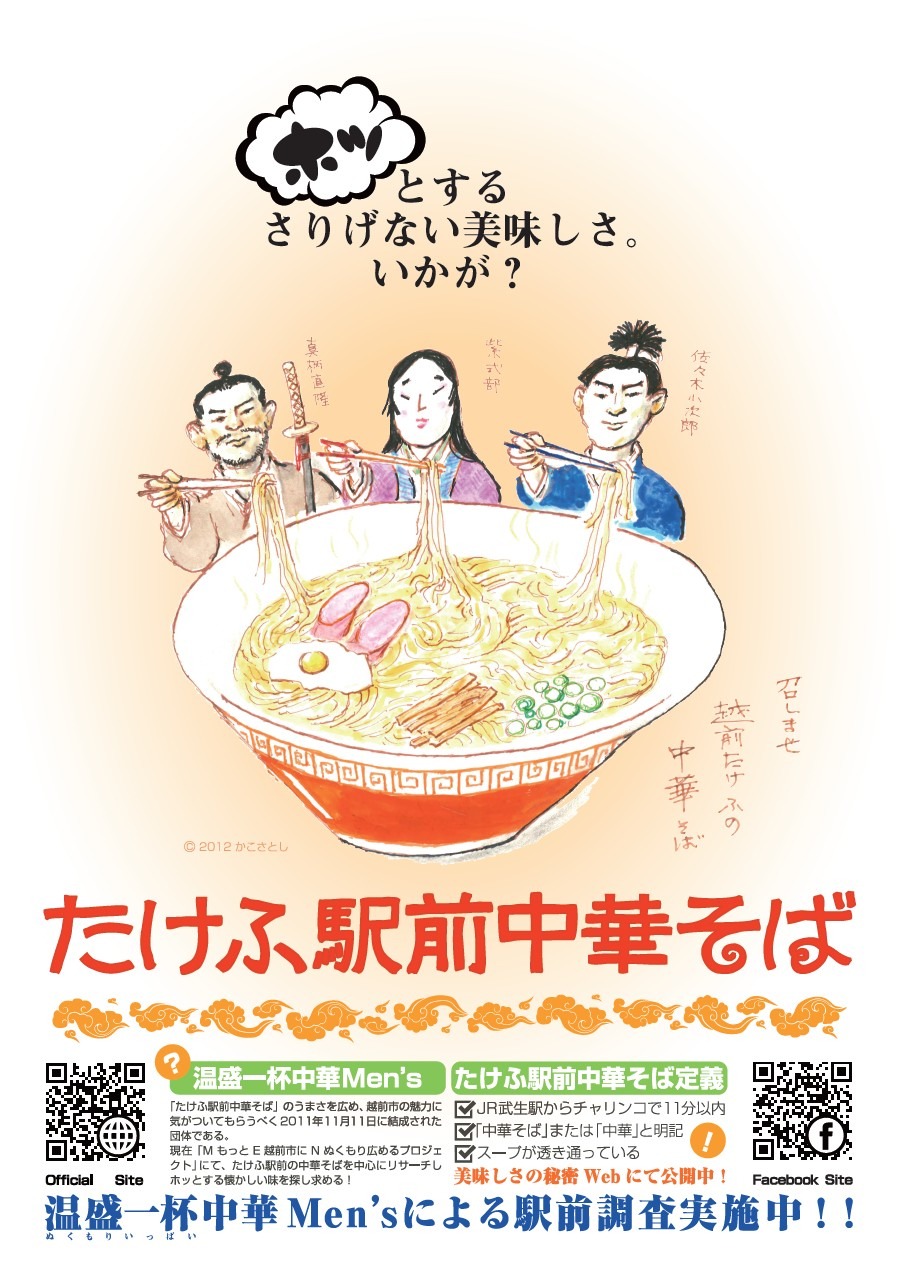 武生駅近くには歴史ある寺社仏閣、絵本作家ゆかりの地等が数多く集中していますが、「歴史の観光だけ」ではもったいない!武生・越前市を訪れたついでに、ぜひ徒歩やレンタサイクルで気軽に訪れて欲しい、心温まる「たけふ駅前中華そば」のデータベースとしてご活用頂きたく、一挙ご紹介したいと思います。