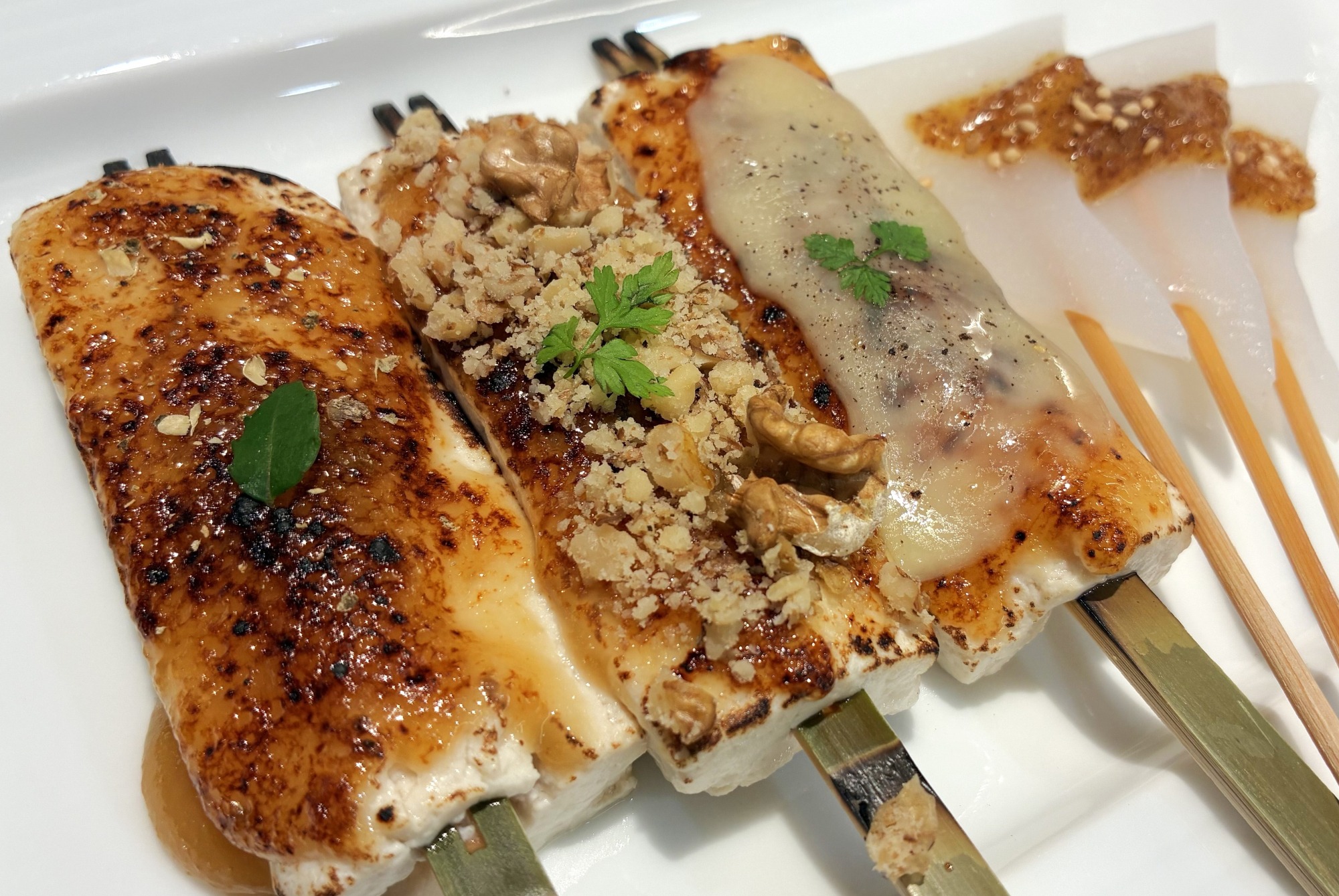 甘味噌・くるみ味噌・ラクレットチーズの田楽3種1本ずつとこんにゃくおでん3本付。