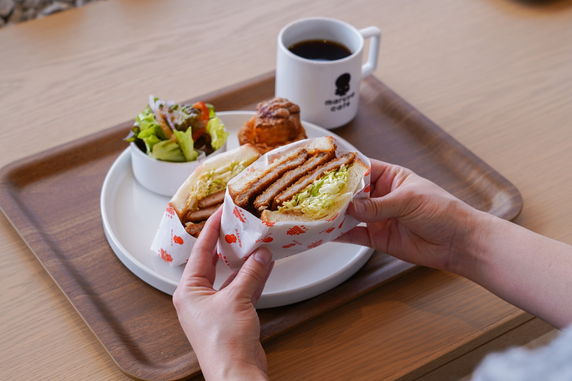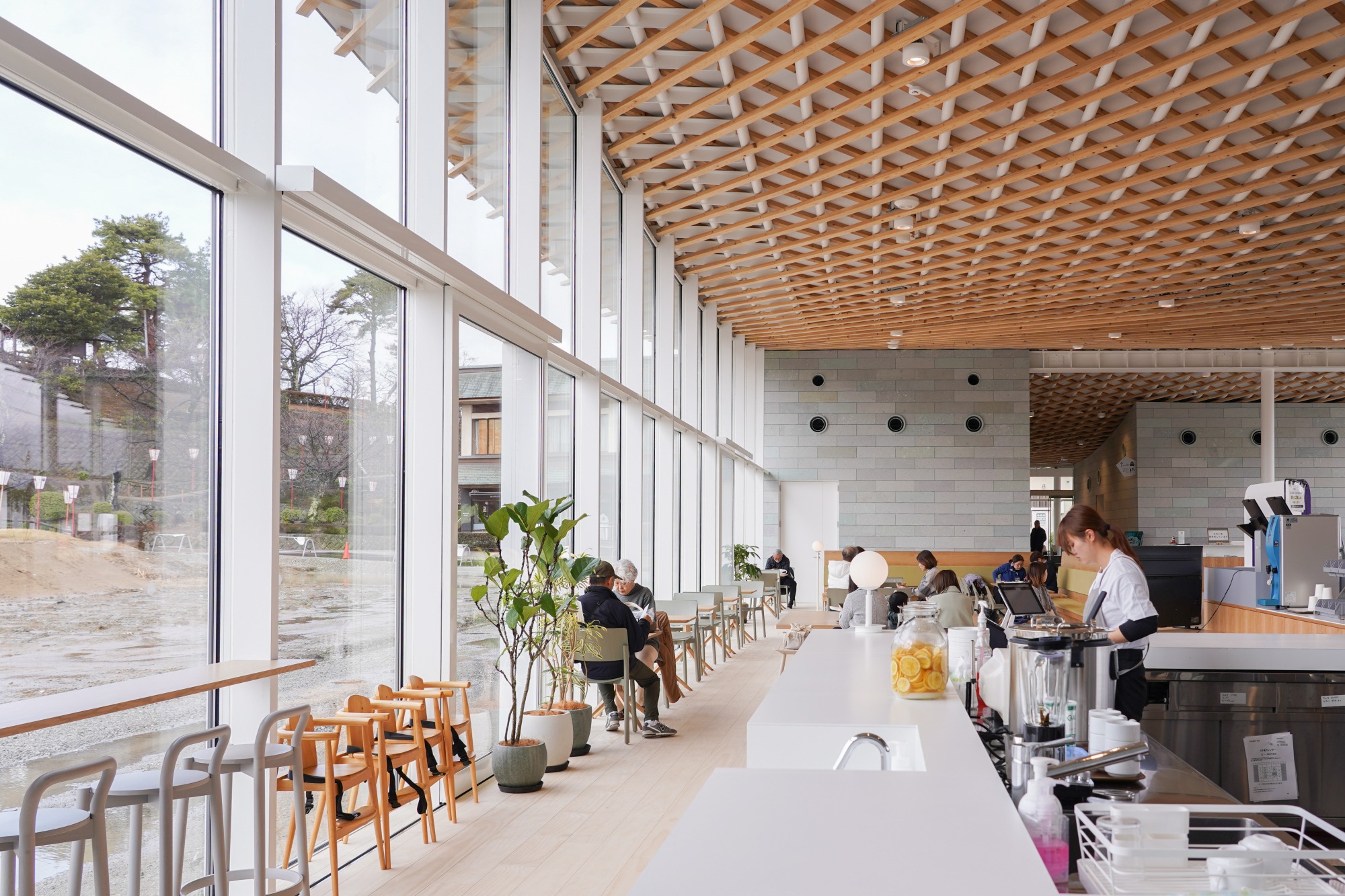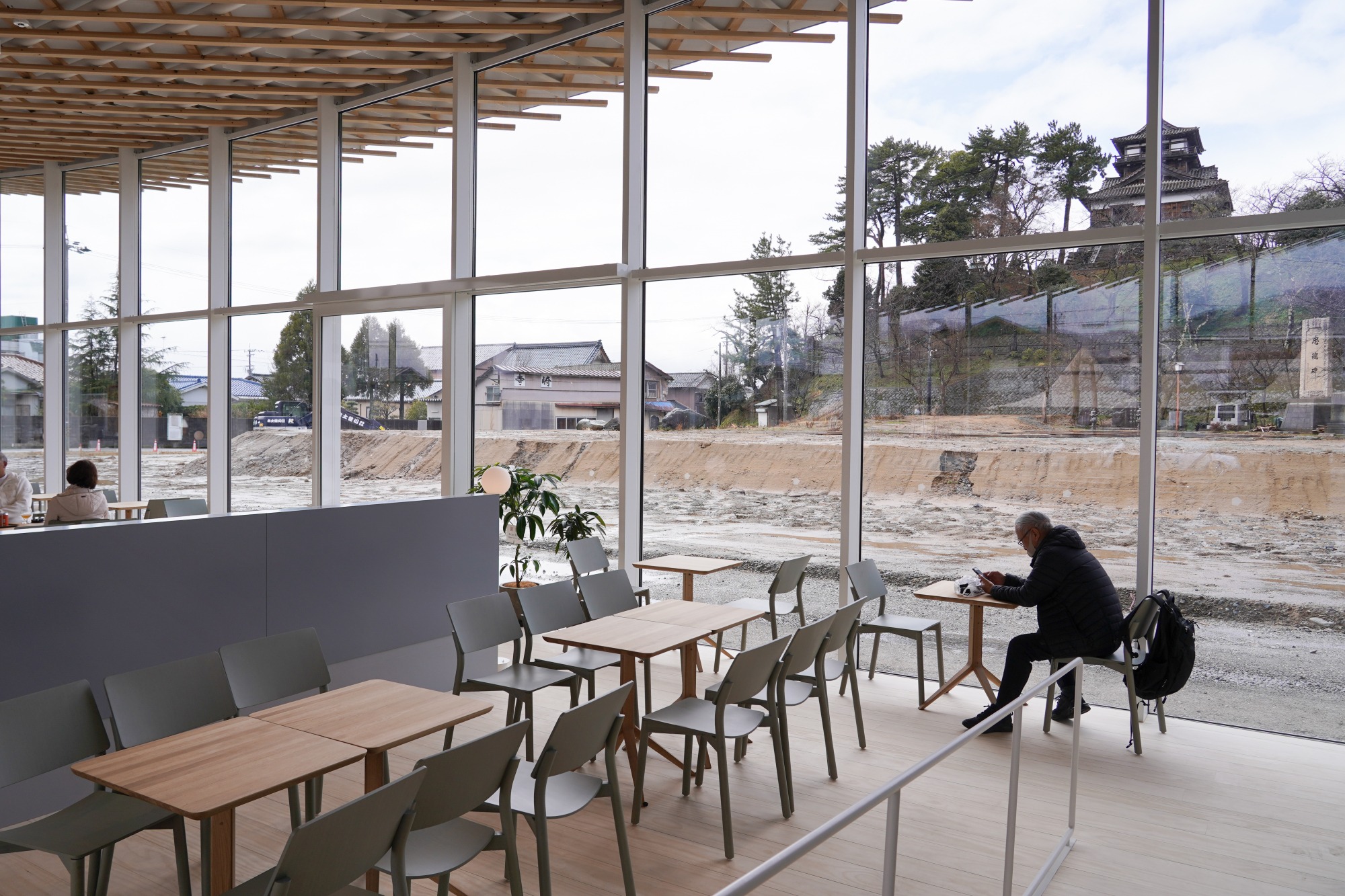 丸岡城横に2025年3月にオープンしたマチヨリマーケット内にある「丸やcafe」では、丸岡城を眺めながら福井の食を楽しむことができます。
