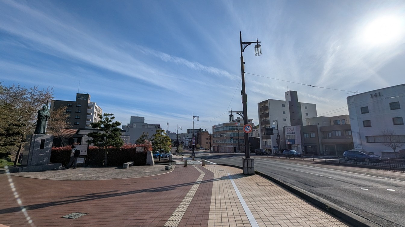 現在の福井市毛矢付近(左手に見えるのは由利公正像)