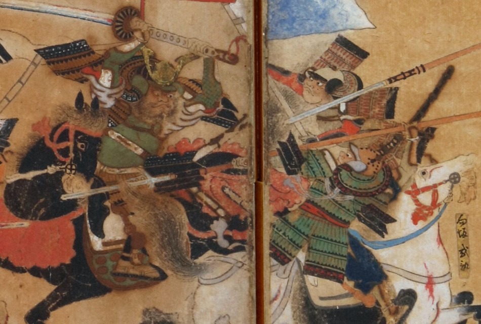 姉川合戦図屏風に描かれる真柄十郎左衛門(左)と匂坂式部(右下)