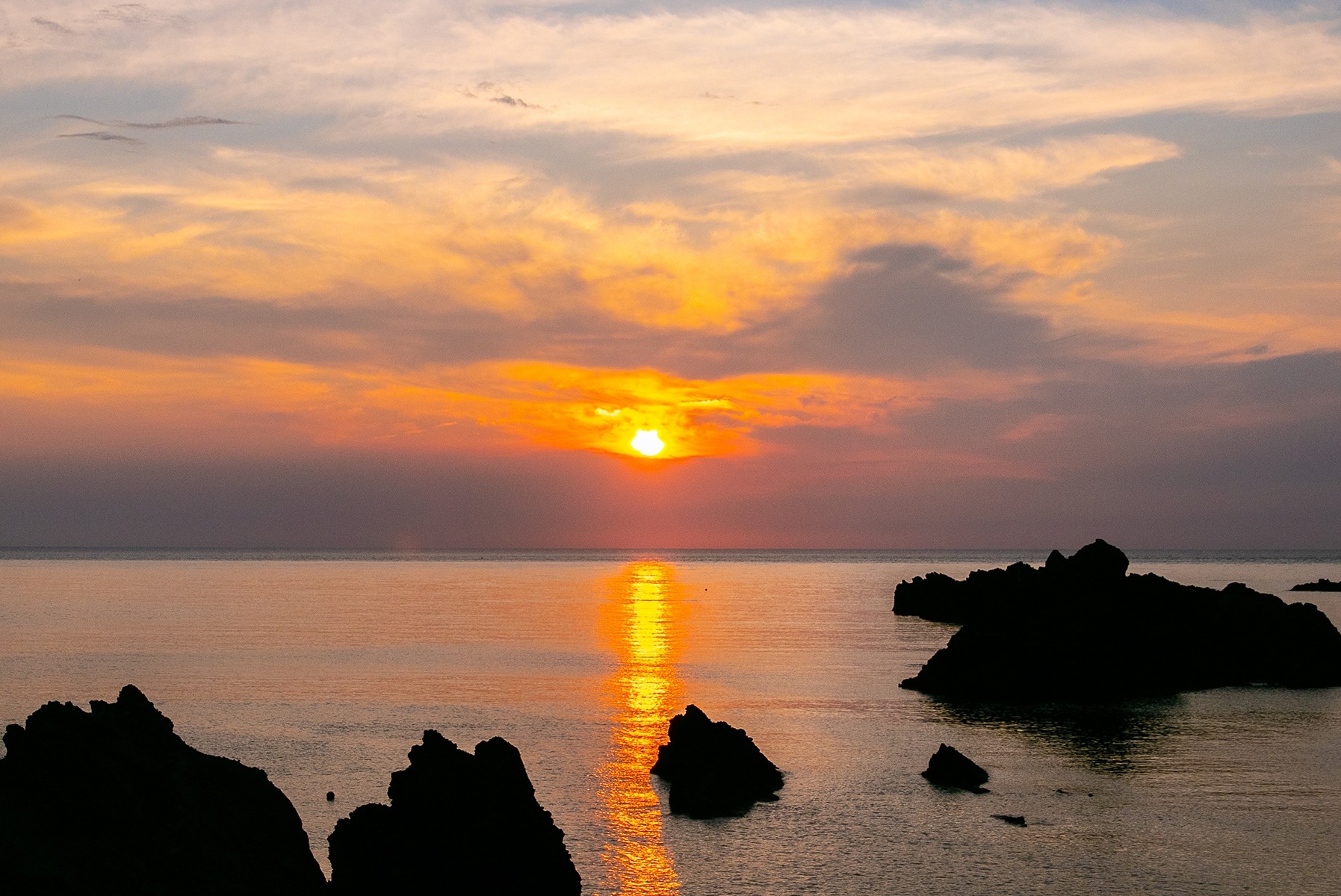 冬の越前海岸で、旅のハイライトとして外せないのが夕暮れ時の美しさです。空が徐々に黄金色から深みのある茜色へと染まり、太陽が水平線へとゆっくり溶けていく様子は、まさに絶景。冬は空気が澄み渡るため、燃えるような夕日がいっそう鮮やかに、そして大きく目に映ります。