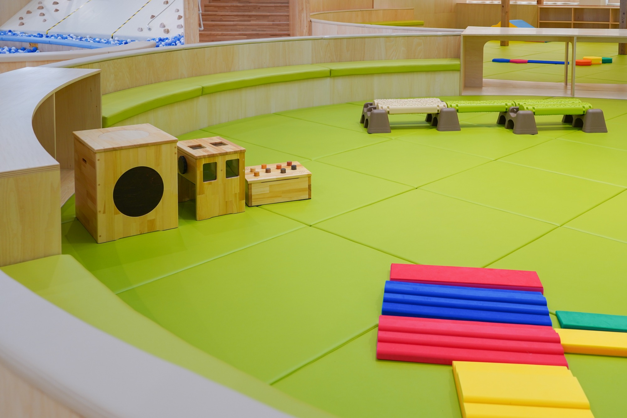 やわらかいクッション性のあるマットの上で、絵本を読んだり小さな遊具で遊んだりと、のんびり安心して過ごすことができます。