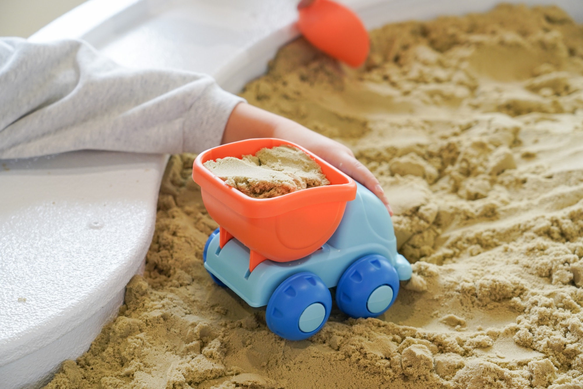 子どもたちに大人気の砂場が、なんと室内に登場! こちらは「キネティックサンド」という、まとまりやすい特殊な砂でできています。