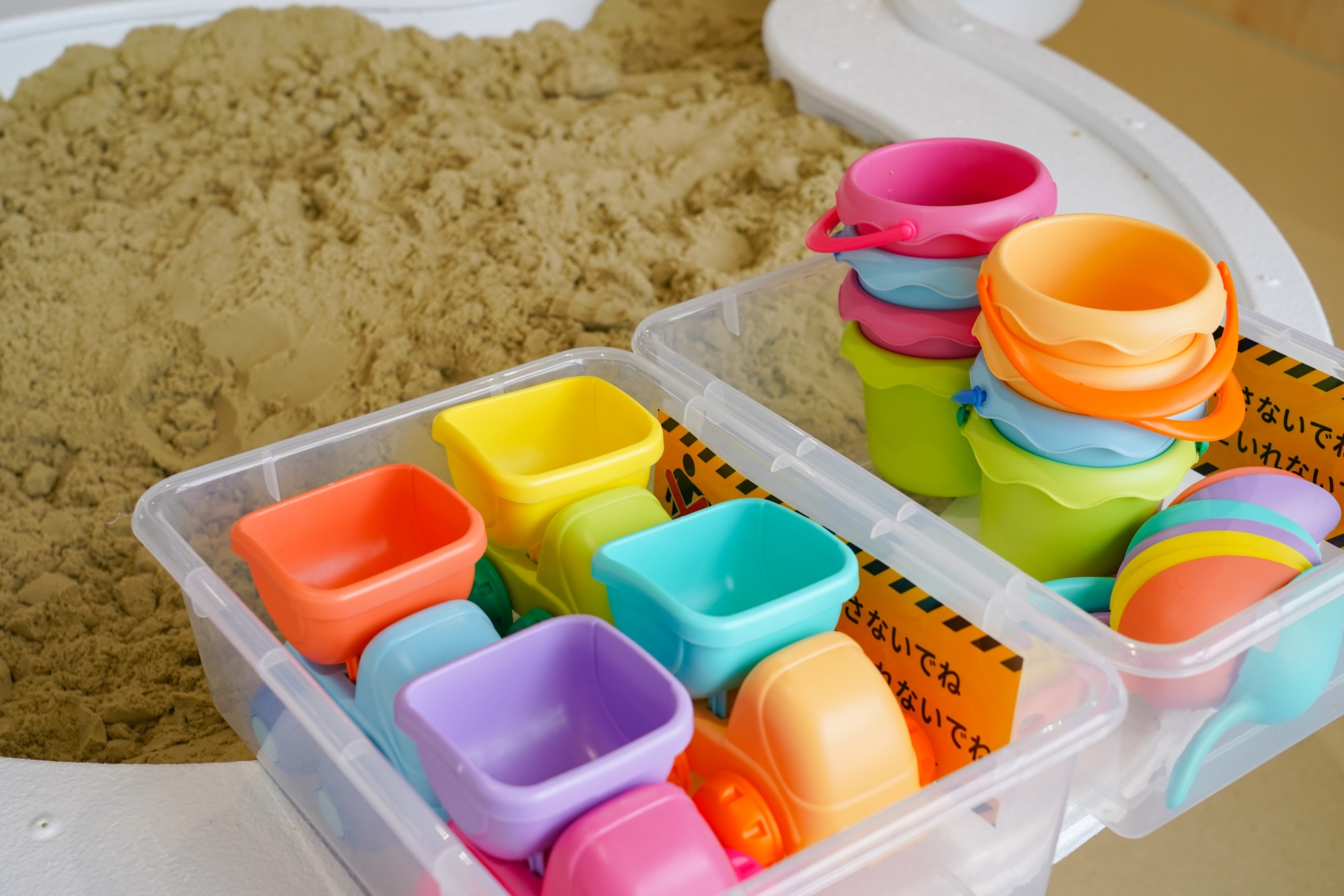 スコップやシャベルなどの道具も用意されており、砂の感触を楽しんだり型抜きをしたりと夢中になって遊べます。