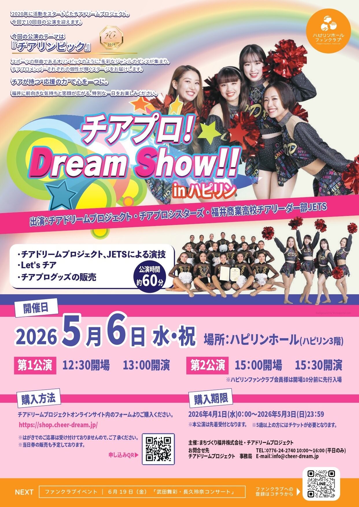 今回の公演のテーマは「チアリンピック」スポーツの祭典であるオリンピックのように、多彩なジャンルのダンスが集まり、チアプロメンバーそれぞれの個性が輝くステージをお届けします。チアが持つ“応援の力”で心を一つに。福井に前向きな気持ちと笑顔が広がる、特別な一日をお楽しみください。