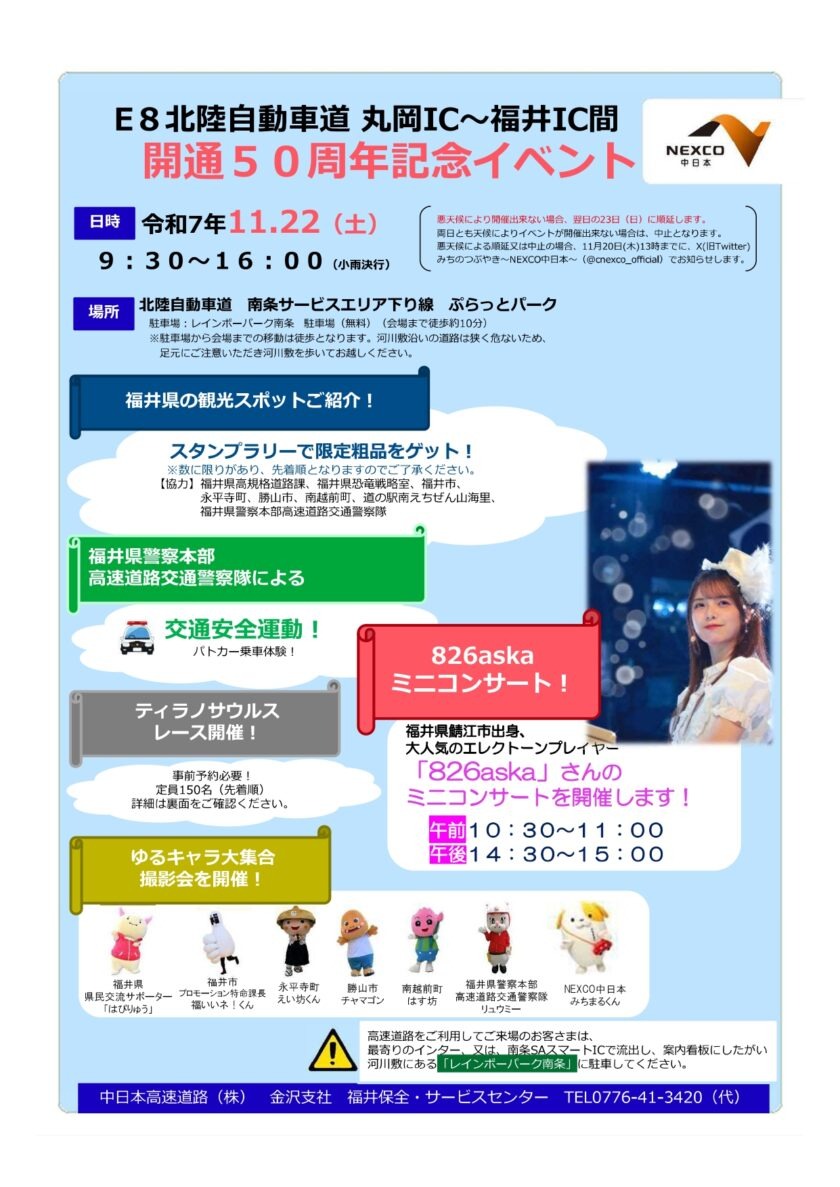 11月22日(土)に、北陸自動車道 南条サービスエリア(下り線)で「丸岡IC~福井IC間 開通50周年記念イベント」が開催されます。