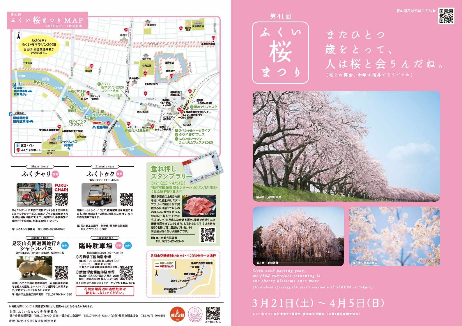 また、ふくい桜マラソン2026の開催日(3月29日)周辺は、市内の一部道路規制や交通量の増加により、例年より混雑する可能性があります。