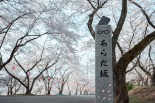 人気漫画に登場するシーンのモデルとなったと言われている桜並木。桜の時期には提灯がともり、多くの花見客が訪れます。2019年3月、「ちはやふる」の登場人物で、あわら市在中の"綿谷 新(わたや あらた)"にちなんで「あらた坂」という愛称になり、かるたの札がささった石碑が建ちました。