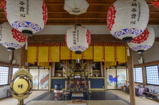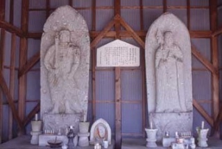 奈良時代の養老年間、泰澄大師の開基と伝え、元は池田町の野尻にありましたが、一乗谷朝倉氏の命で天文2年(1533)に越前府中のこの場所に再興された天台宗寺院です。山門をくぐって奥の左手に、石造の不動明王と地蔵菩薩が並び立っており、地蔵菩薩の光背には「永禄三庚申(1560)十二月四日施主敬白」の銘があり、一乗谷にある石仏と同じ様式のものなので、これも朝倉氏のゆかりで造られたと考えられます。不動堂に祀る腹籠不動明王は、鞘仏が江戸時代初期、胎内仏の本尊が室町時代のもので、いずれも市指定文化財です。なお境内の祠内には、織田信長の越前攻めの際に、信長方についた朝倉景鏡の供養塔も立っています。