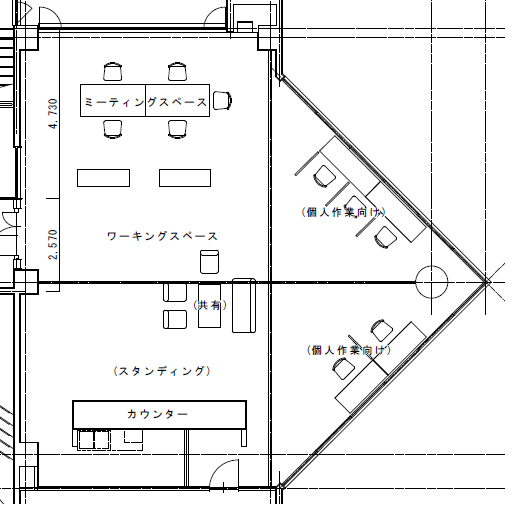 ・室内のオフィス家具は移動可能で、利用シーンに合わせて配置を変えることができます。
