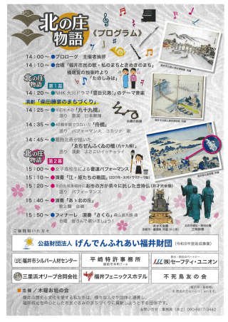 今から450年前、柴田勝家は北の庄に壮大な城と城下町を築きました。福井市の礎はここに始まります。九十九橋や舟橋のインフラを整備しまちは賑わいましたが、わずか8年で落城の憂き目にあいました。勇猛果敢で律儀な勝家、芯が強く天下一の美人と称されたお市の方。「北の庄物語」は勝家とお市の方、三姉妹の人生ドラマを様々な分野の人々が力を合わせ舞台として表現する初めての取り組みです。ぜひ、ご覧ください。