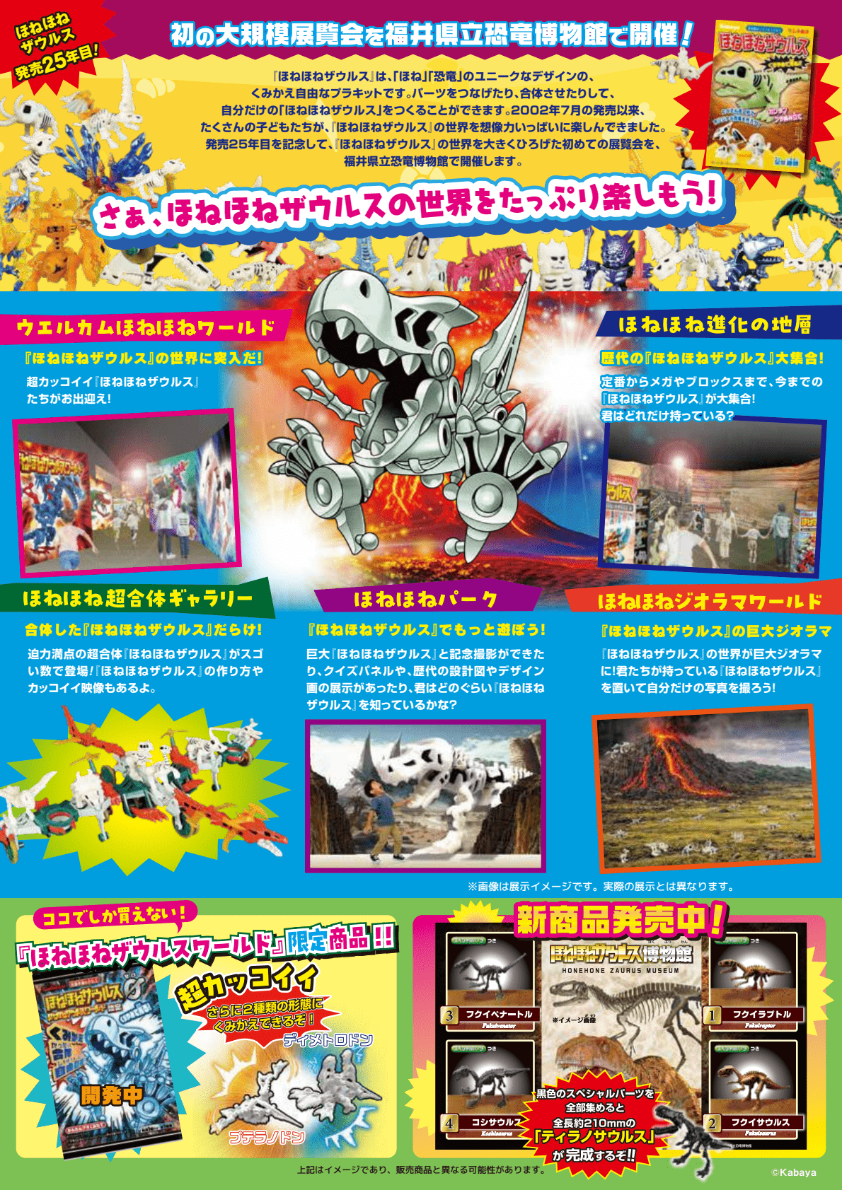 ほねほねザウルスは、「ほね」「恐竜」のユニークなデザインで、組み換え自由なプラキット。パーツをつなげたり、合体させたりして、自分だけの「ほねほねザウルス」をつくることができる。2002年7月の発売以来、たくさんの子どもたちが「ほねほねザウルス」の世界を想像いっぱいに楽しんできました。発売25周年を記念して「ほねほねザウルス」の世界を大きくひろげた初めての展覧会を福井県立恐竜博物館で開催します。